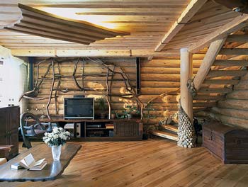 Ce matériau modélise les murs d'une maison en rondins pour la décoration de bois coûteux, ennoblit ainsi l'intérieur.