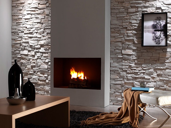 Dans l'image ci-dessus, vous pouvez voir un intérieur magnifique où le mur de la cheminée est décoré de pierre de plâtre.