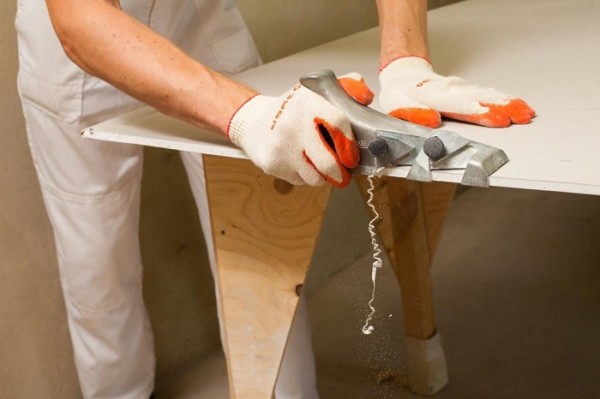 Astuce: afin d'assurer un jeu, afin de sceller qualitativement les joints par la suite avec du mastic, il est nécessaire de former un chanfrein biseauté au bord de la feuille avec une inclinaison d'environ 22,5 ° degrés avec un plan spécial pour les cloisons sèches.