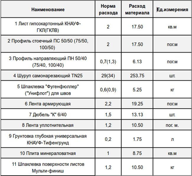 Pour calculer la quantité approximative de matériaux, un tableau est présenté dans lequel sont indiqués les taux de consommation des matériaux nécessaires à l'installation du mur, dont les dimensions: