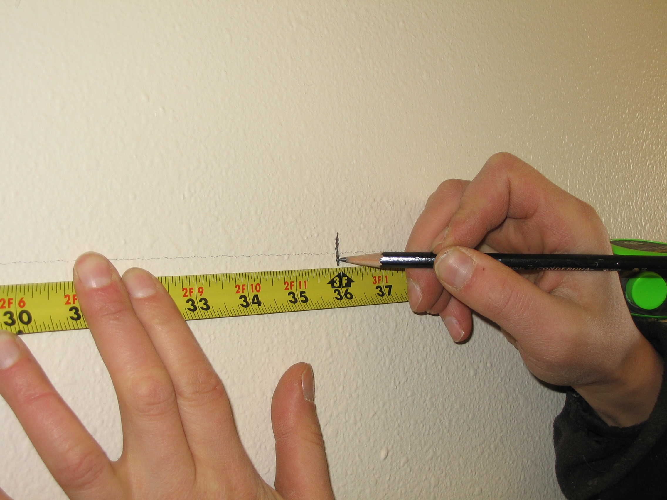 Tout est prêt. Nous avons maintenant un certain nombre de bandes verticales, mais nous devons déterminer les endroits pour fixer les fils à plomb. Pour ce faire, nous divisons simplement la hauteur du mur en deux et mettons une marque à cet endroit. Maintenant, nous divisons chaque segment en deux, et ainsi de suite, jusqu'à ce que la distance entre les points les plus proches se rapproche de la marque de 30 à 60 centimètres.
