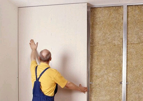 Pour couvrir les murs porteurs, créer des cloisons décoratives et des structures de plafond, des feuilles de cloison sèche standard sont généralement utilisées. - Ainsi, après, d'une part, le revêtement des cloisons en plaques de plâtre est terminé, leur espace est rempli de plaques de laine minérale ou de polystyrène. Dans ce cas, ils joueront le rôle d'isolation acoustique.