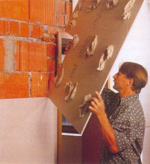 Une fois installé, le panneau est fermement appuyé contre le mur et est réglé au niveau de légers coups. Au moins trois feuilles sont placées en même temps.