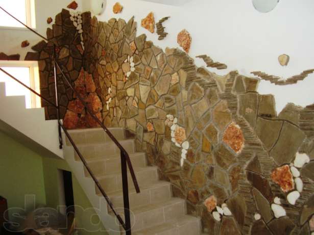 Afin de concevoir telle ou telle pièce, l'utilisation de la pierre naturelle dans la décoration peut être réalisée selon différentes règles. Ainsi, par exemple, une sorte de mosaïque faite de pierres de différentes formes, tailles et couleurs convient à la salle de bain.
