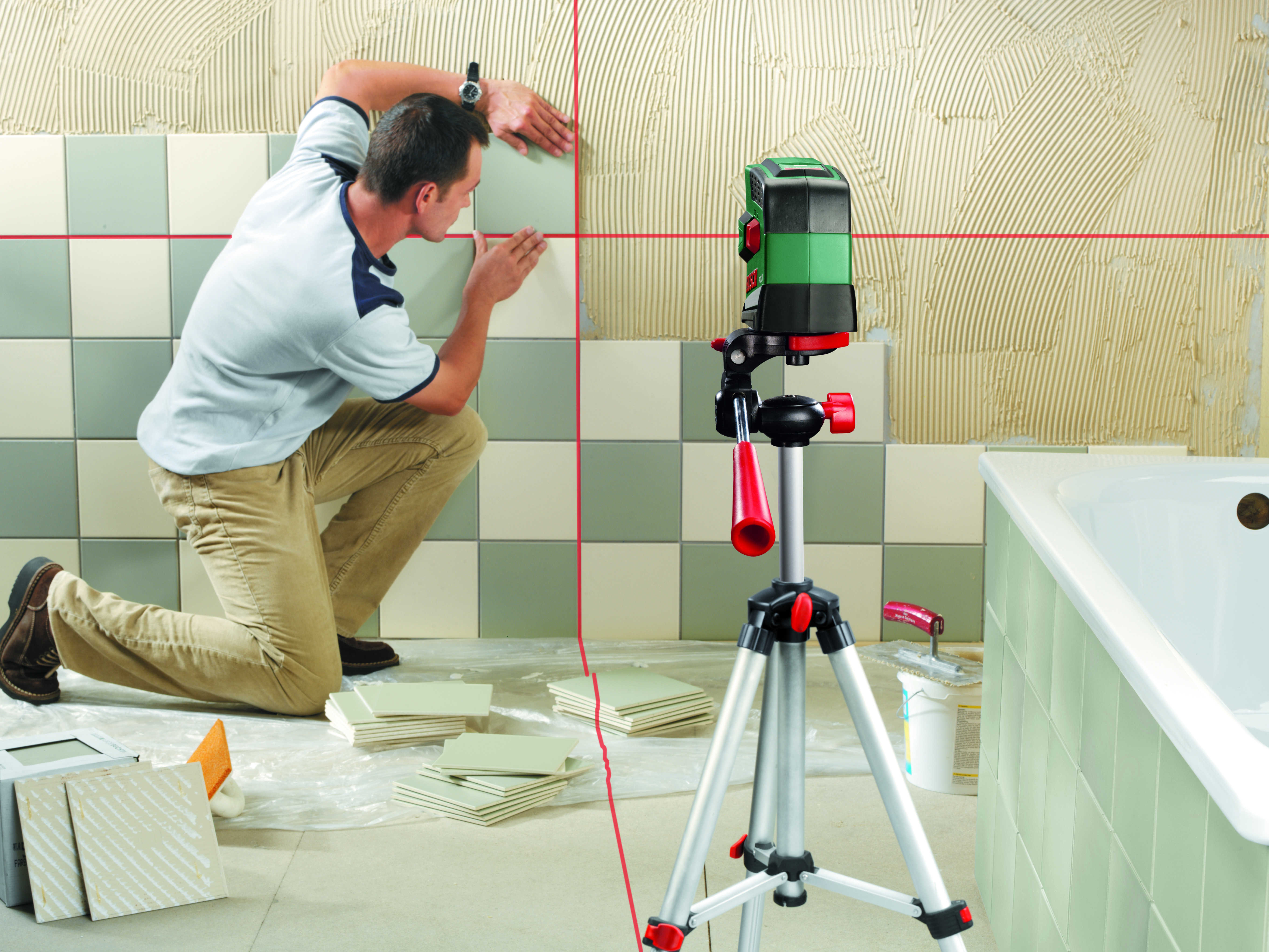 - Avec de gros volumes de travail, les artisans installent des balises à cordes, et dans une petite pièce, vous pouvez vous en passer. Ensuite, ils le font: le mur est divisé en quatre captures à l'aide d'un cordon de teinture ou, comme dans l'image ci-dessous, d'une jauge de niveau laser.