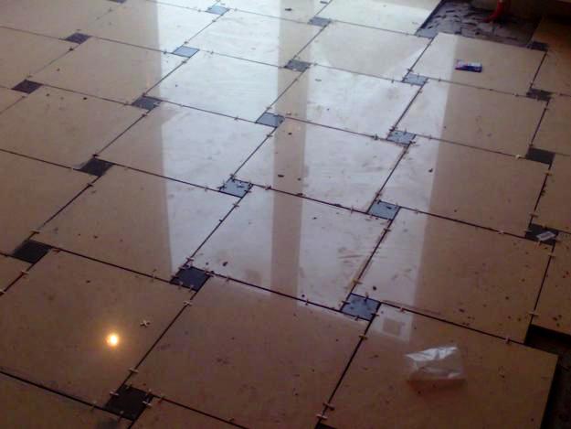 En cas de détection de lacunes, il est nécessaire de corriger les tuiles qui sont à côté de la fente et qui dépassent de la planéité générale de la rangée. - Lors de la pose, n'oubliez pas les croix qui sont insérées dans les coutures afin que la largeur de la couture soit uniforme le long de la rangée verticale.