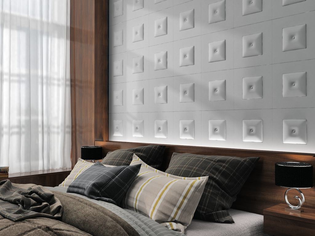 Les panneaux volumétriques peuvent être fabriqués non seulement à partir d'un réseau ou d'un MDF. Aujourd'hui, les éco-panneaux, dans la production desquels du bambou concassé, des roseaux, des copeaux de bois, sont très appréciés. Bien que ce ne soit pas du bois en tant que tel, le matériau est naturel et respectueux de l'environnement. Les dimensions de ces panneaux sont standard: 500 * 500 m, ou 625 * 800 mm.