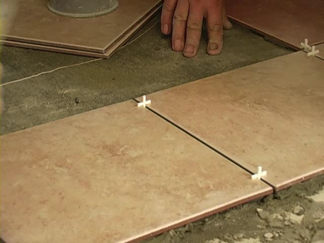 - Les professionnels n'insèrent pas de croix dans le mélange de 4 tuiles et ne les noient pas. Un seul pétale est inséré afin que vous puissiez facilement l'obtenir plus tard. Le mélange sous la tuile doit être réparti uniformément, ne laissez pas de vides dans les coins. Lors de l'installation, périodiquement, il est nécessaire de nettoyer les coutures, cela se fait avec la même «croix», puis il est balayé (avec une brosse - une brosse).