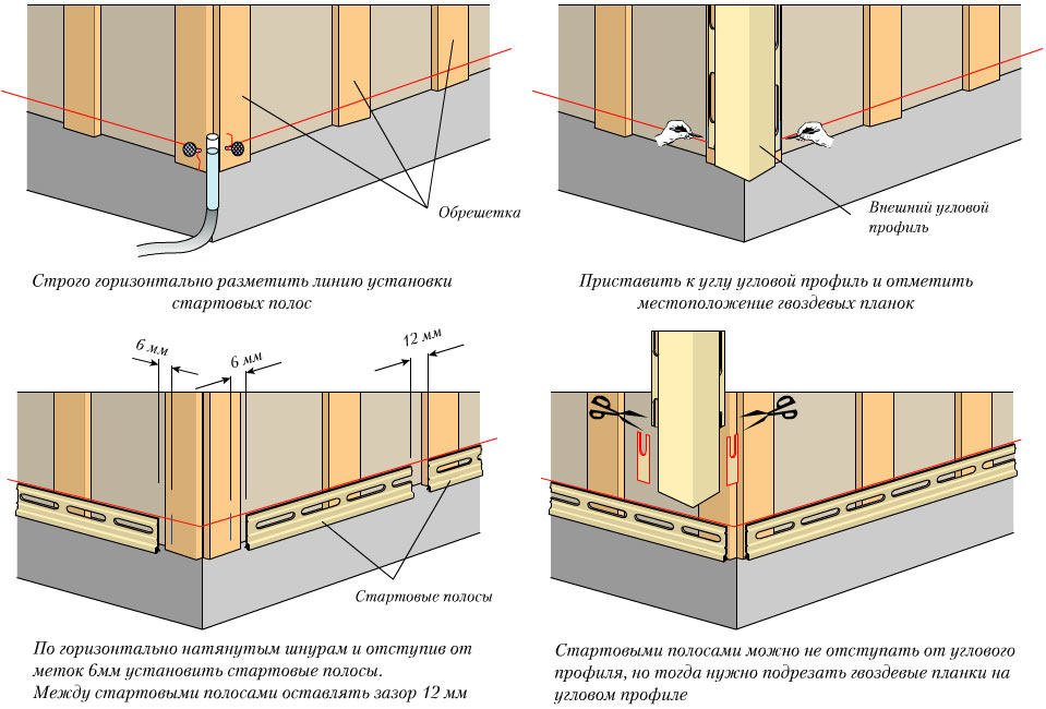 Compte tenu de la dilatation thermique, il est impossible de les joindre étroitement dans tous les cas - vous devez laisser un espace de 5-7 mm. - Aux endroits où la connexion d'extrémité des panneaux sera effectuée et, en conséquence, le profil H sera installé, la barre doit être coupée, en laissant un espace de 12 mm. Dans le diagramme ci-dessus, tout est très clairement représenté. Ensuite, les coins externes et internes sont montés - ils peuvent être joints avec un chevauchement.