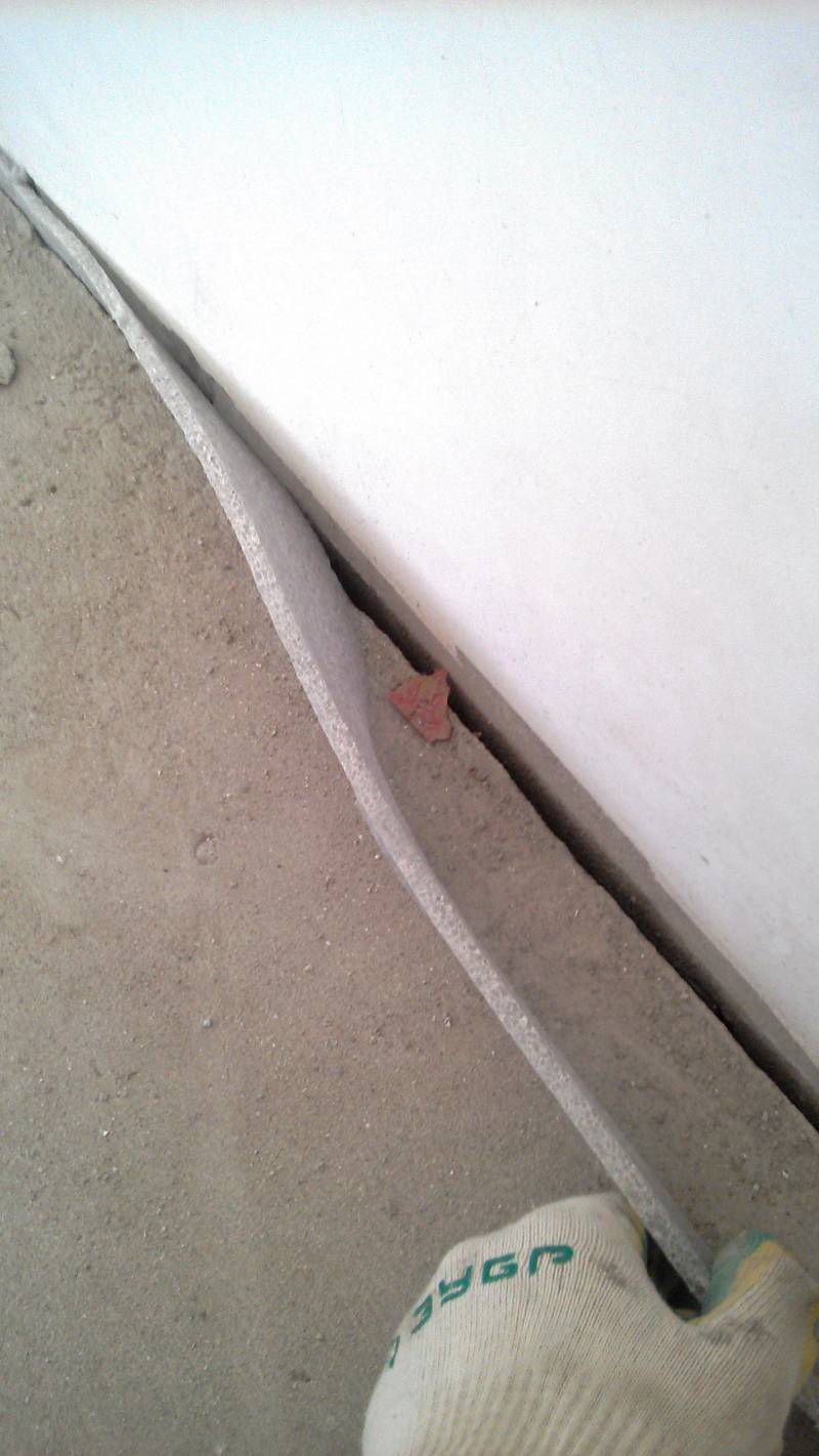 - Ensuite, fermez les vides restants du ruban amortisseur. Toutes ces mesures sont nécessaires pour que le plancher de vrac liquide ne coule pas. Sinon, sur votre surface, les entonnoirs et les immersions sont garantis.