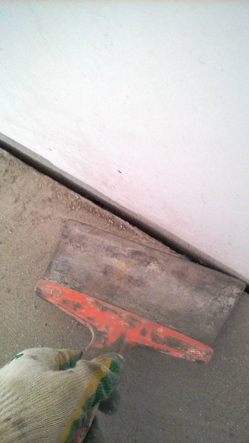 - Maintenant, nous prenons à nouveau la spatule dans nos mains, et nous traitons les bords libérés, sur lesquels, lorsque la chape entre en contact avec le ruban, un affaissement se forme inévitablement. Nous devons les nettoyer.