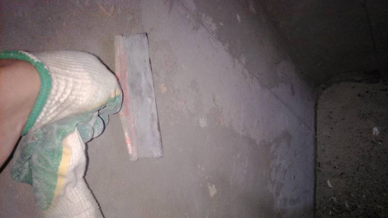 - Prenez une spatule dans vos mains et commencez à parcourir systématiquement toute la surface des murs, en essayant de racler toutes les excroissances à zéro. Si quelque chose ne fonctionne pas avec une spatule, vous pouvez travailler un peu avec un marteau (pioche) ou un poinçon.