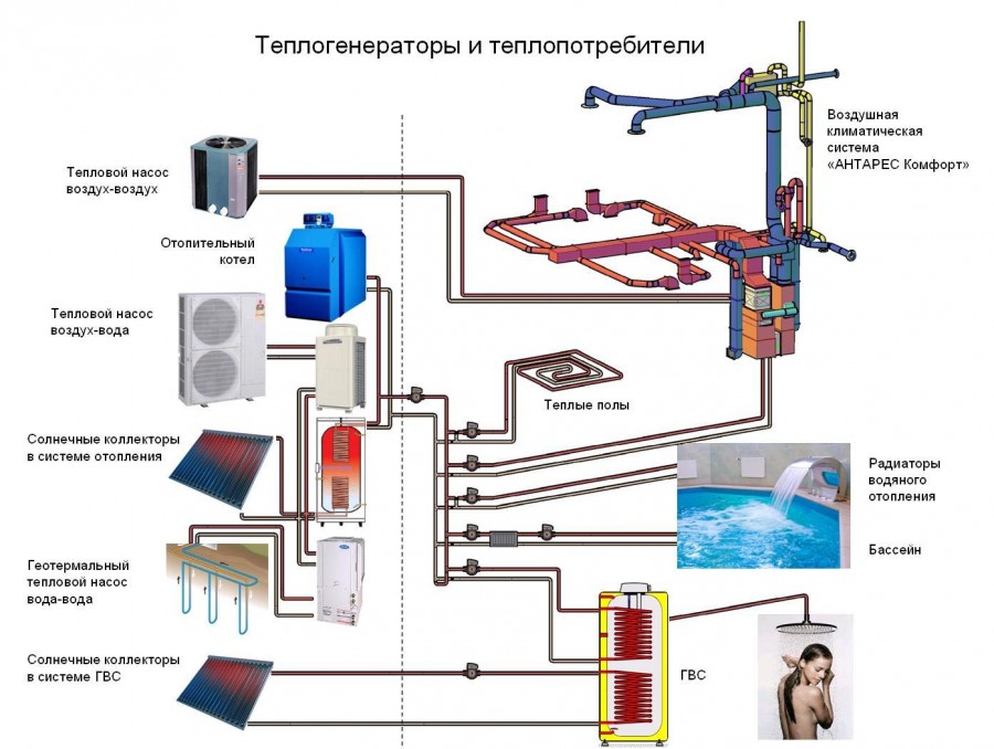 - La maison est alimentée en eau chaude, et elle est chauffée selon le système «plancher chaud», au moyen d'une pompe à chaleur géothermique, couplée à des capteurs solaires. Pour plus de clarté, voici un diagramme. Aux valeurs critiques des températures hivernales, le préchauffage du liquide de refroidissement est effectué à l'aide de radiateurs électriques.