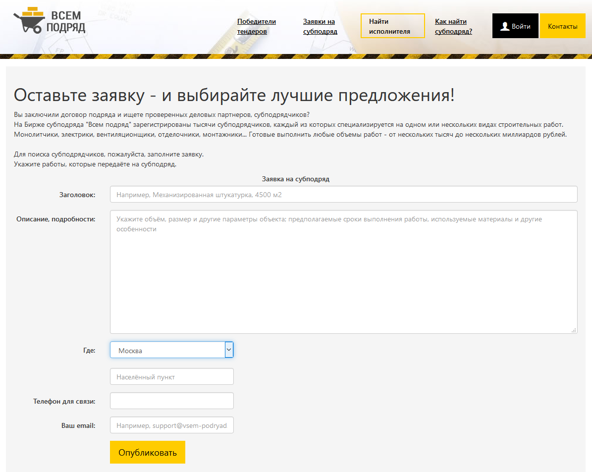 - Une section sur la recherche de sous-traitants, où vous pouvez créer une application gratuite pour les travaux de construction dans une région particulière de la Fédération de Russie. Des milliers de nos visiteurs verront cette application dans quelques heures.