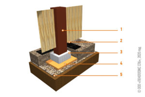 Pour éviter le soulèvement dû au gel, le support de la fondation de la clôture est approfondi de 30 à 40 cm et le sol soulevé est remplacé par un coussin de sol. Pour éviter le gel du sol et la pression sur les supports, une couche d'isolation thermique durable et résistante à l'humidité est posée.