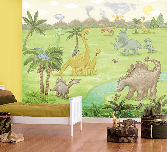 Les images de la nature, des animaux, des dinosaures ou des thèmes de voyage sont intéressantes pour tous les garçons sans exception. L'essentiel est que le papier peint photo soit dans des tons verts, jaunes ou beiges.