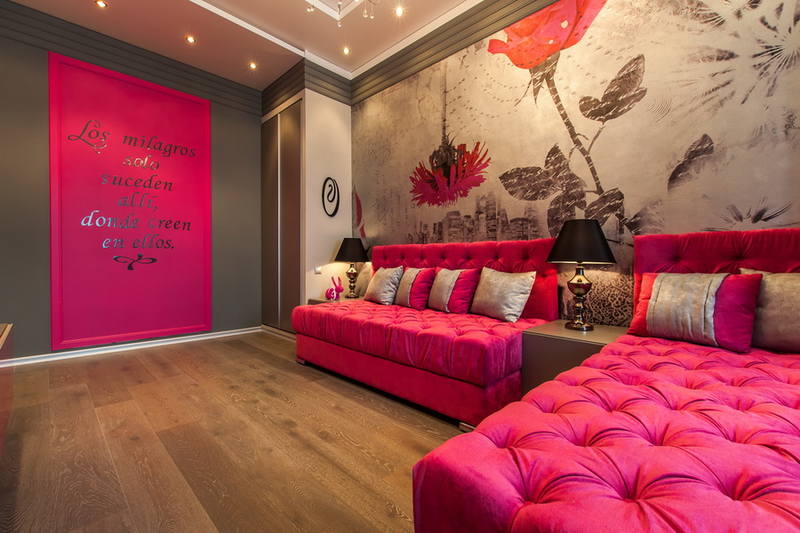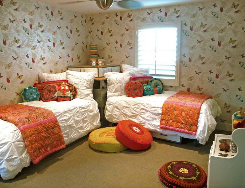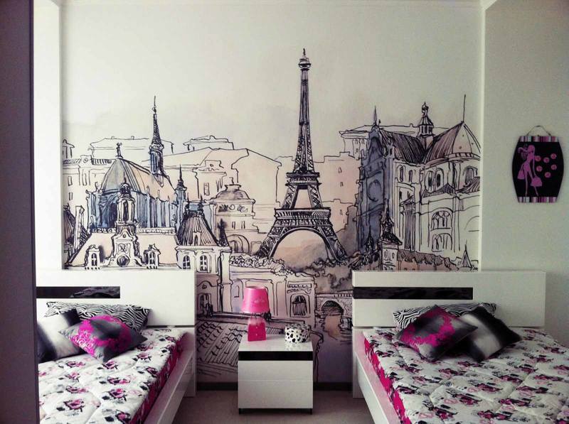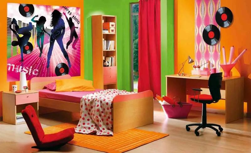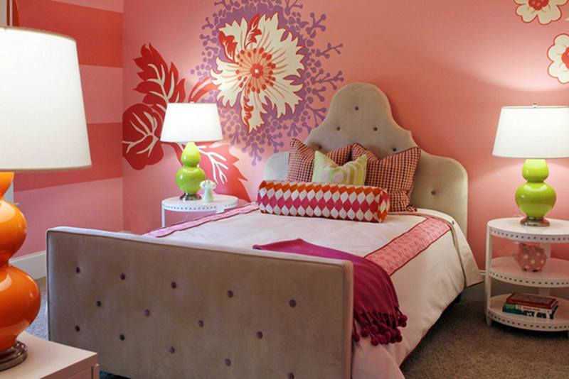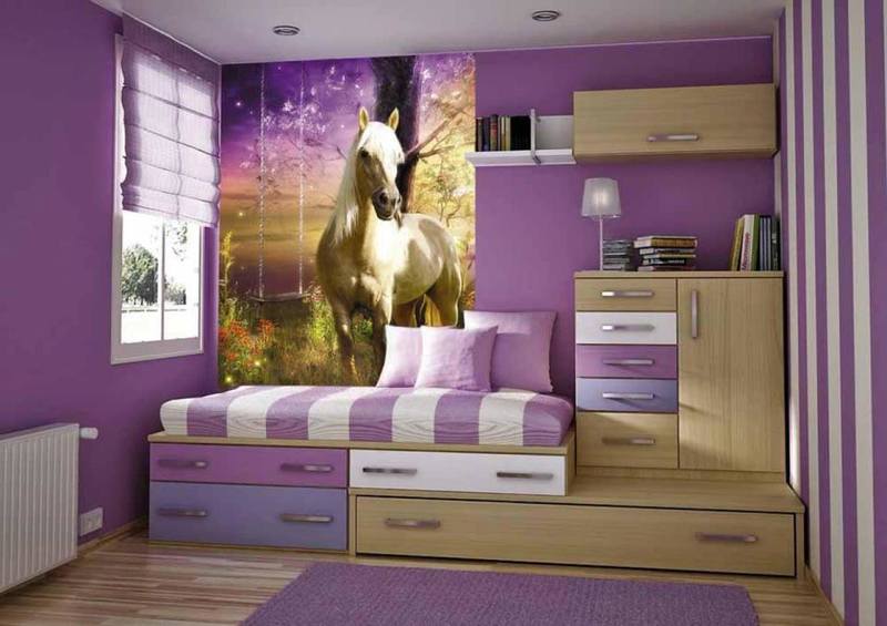 - Lors du choix du papier peint photo, la nature de la jeune femme doit être prise en compte. Si la fille est calme, sujette à des humeurs mélancoliques, alors elle peut être «excitée» en utilisant des peintures murales chaudes avec un motif contrasté dans la pièce.