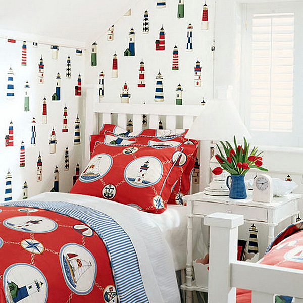 Le thème marin et les couleurs qui le concernent sont également une solution universelle. Ce peut être toutes les nuances de la vague de la mer avec des images de navires, du monde sous-marin, des récifs et des coquillages;