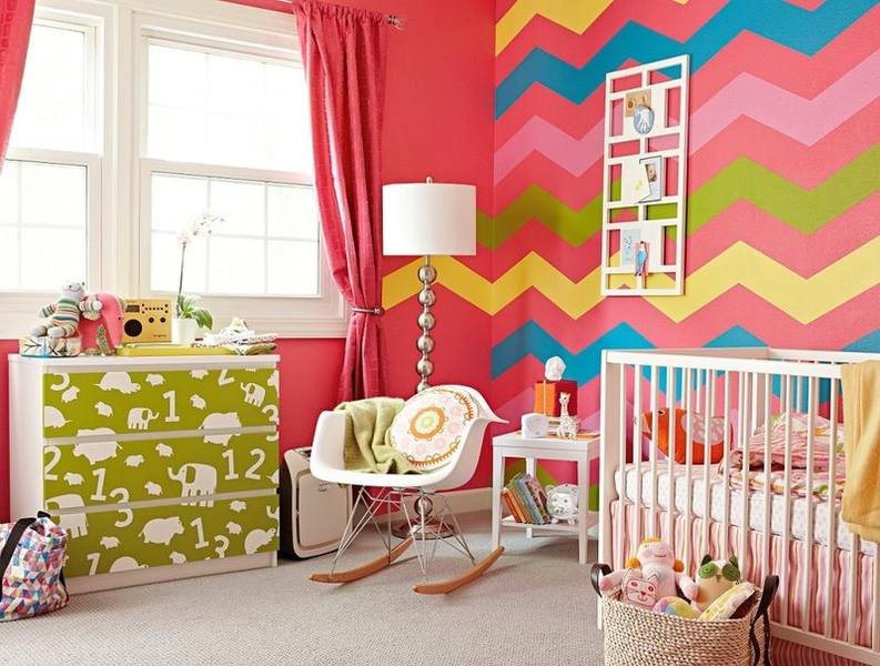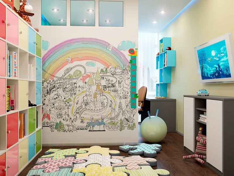 - Pour une fille d'âge préscolaire Vous pouvez choisir des peintures murales hétéroclites lumineuses sur lesquelles son «art» ne sera pas particulièrement visible;
