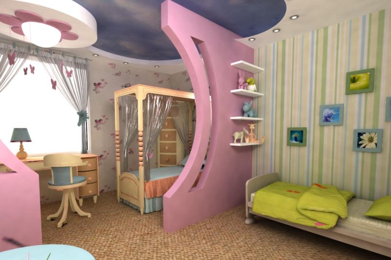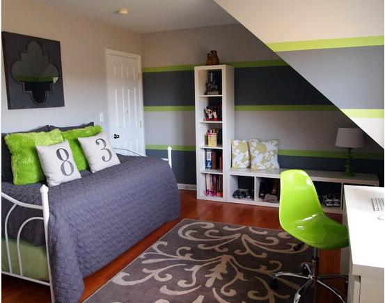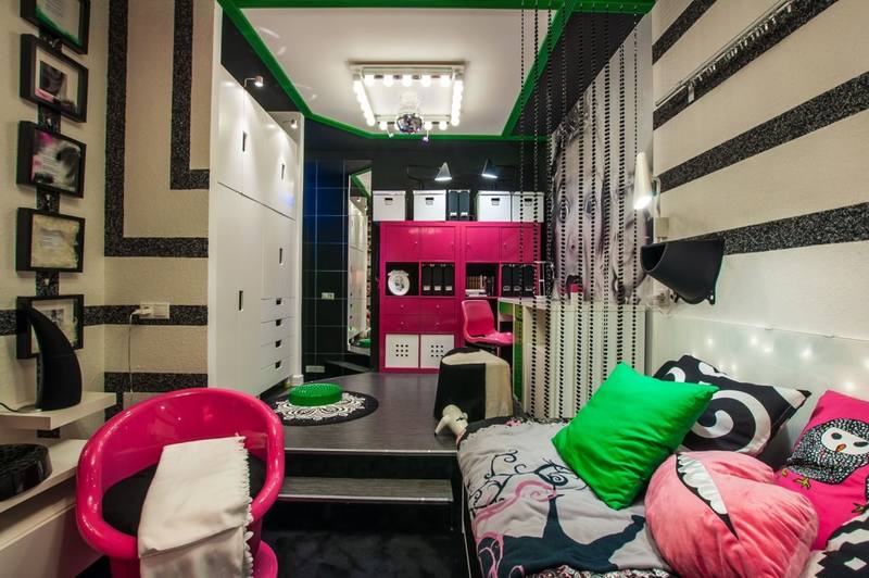 Dans la zone de sommeil et d'étude, les couleurs vives ne doivent pas être utilisées, elles seront plus belles dans la zone de jeu ou dans la zone de réception de la salle d'adolescence, dans laquelle vous pouvez mettre un petit canapé ou plusieurs poufs.