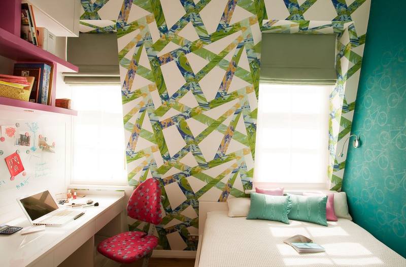 Malgré un concept unique de l'intérieur, vous pouvez combiner différents motifs de papier peint et leur texture, créant une solution de design intéressante. En utilisant cette technique, plusieurs zones fonctionnelles peuvent être distinguées dans la chambre de la fille - un lieu d'étude, de sommeil, de jeux, de garde-robe.