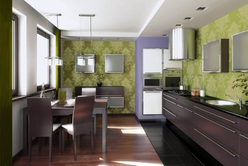 De plus, en utilisant différentes couleurs ou en changeant la texture du papier peint, vous pouvez zoner la pièce. Ceci est extrêmement important dans une petite cuisine ou une cuisine combinée (voirQuel est le meilleur papier peint pour la cuisine: faites un choix).