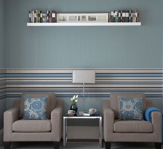 L'option classique est: l'utilisation de papier peint à rayures au bas du mur et au sommet avec des motifs floraux, les deux parties sont séparées par une bordure. Cette option peut être rendue plus compliquée en utilisant une texture différente du papier peint ou en brisant le mur en hauteur en trois ou même quatre segments.