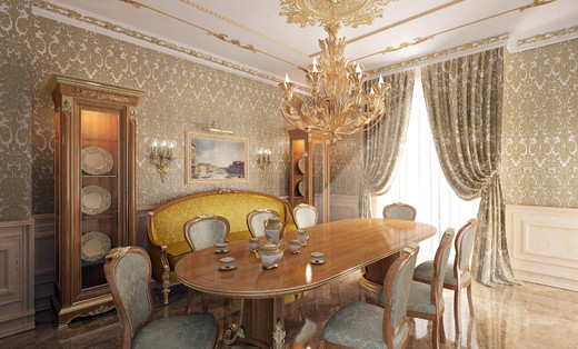 Une autre caractéristique du style classique est la présence de toutes sortes de motifs, boucles, lignes et arrangements floraux. Ils peuvent être affichés non seulement sur le revêtement mural lui-même, mais aussi dans d'autres mais aussi dans d'autres meubles et intérieurs.