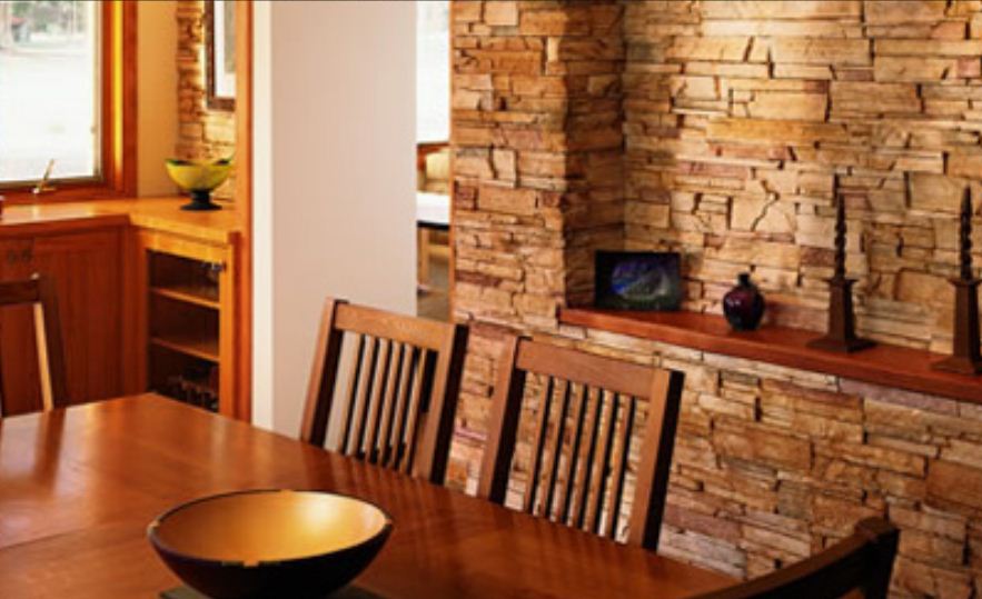 Le matériau se fondra dans un canapé en cuir, des étagères et une cheminée. Il est conseillé d'introduire du blanc à l'intérieur, sinon la pièce peut devenir trop sombre.
