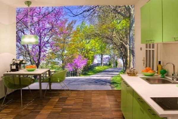 À l'intérieur de la cuisine, en plus du papier peint traditionnel en vinyle ou en papier, vous pouvez également utiliser du papier peint photo. Ces papiers peints peuvent être collés (voirPapier peint: comment le faire correctement) sur tout le mur ou limité à une partie du mur. De plus, des peintures murales peuvent être utilisées pour décorer la zone de travail, c'est-à-dire comme un soi-disant tablier.