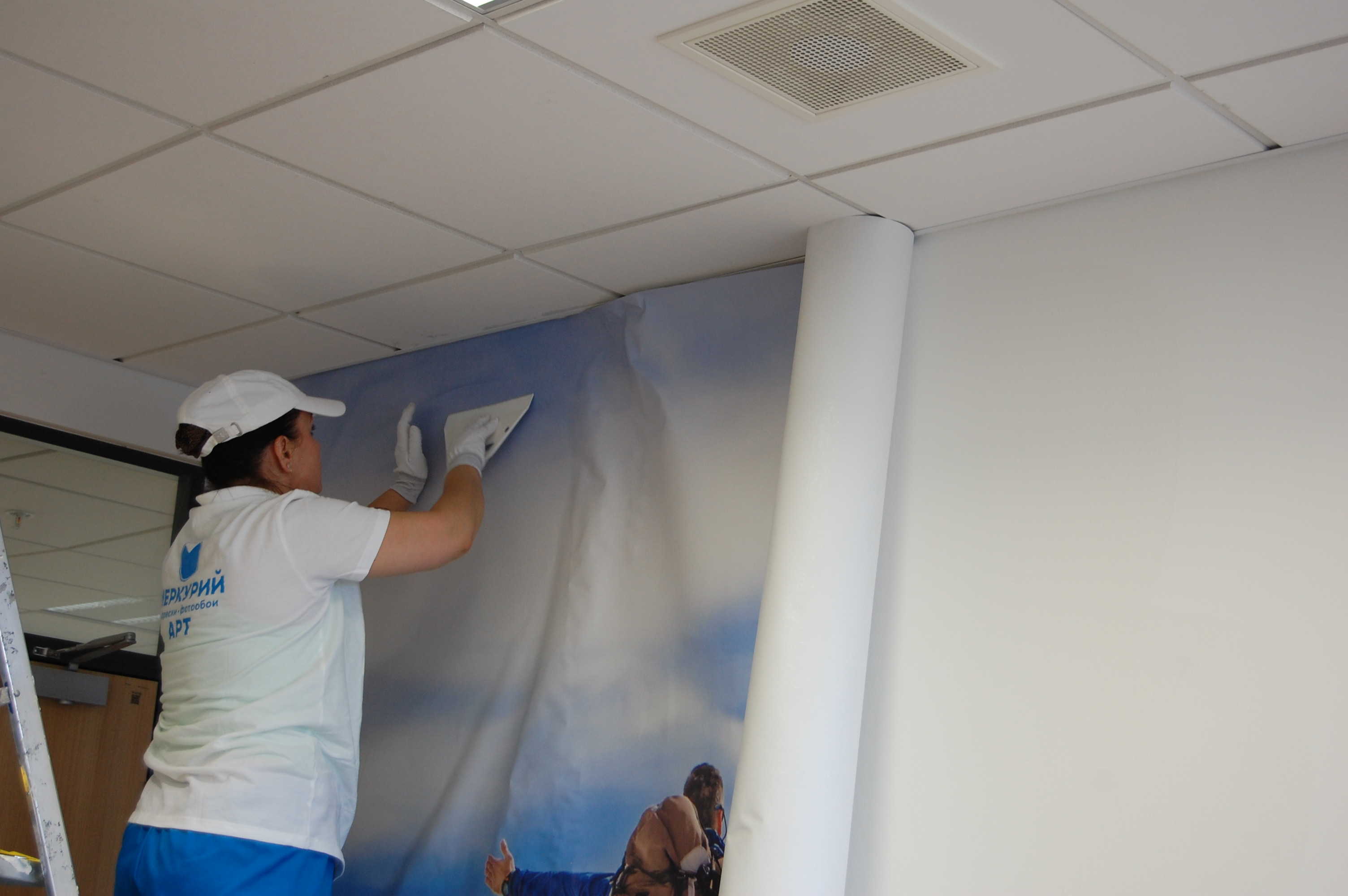 Maintenant, en retirant progressivement le papier protecteur, lissez le papier peint dans le sens du collage, en expulsant progressivement toutes les bulles d'air. Il est préférable de le faire ensemble, lorsqu'une personne tire lentement la couche de protection sur elle-même, et la seconde, lisse la toile en la collant au mur.