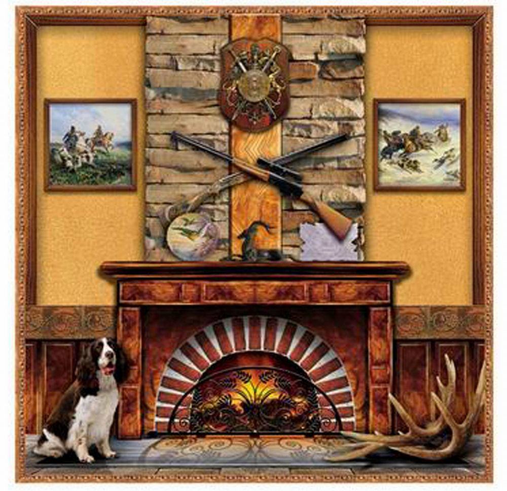 - Cheminée de chasse - Ceci est une image d'une cheminée contre un mur avec une collection de fusils de chasse ou d'animaux en peluche. Très souvent, un tel motif peut compléter le chien de chasse reposant près de la cheminée. Cette photo est idéale pour le bureau.
