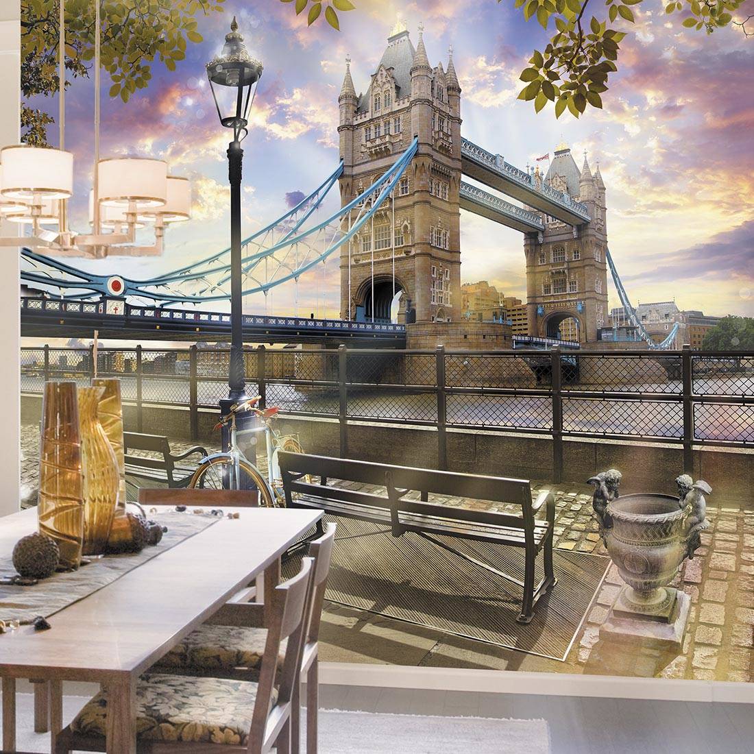 Dans de telles photos, il semble plongé dans une brume brumeuse, ce qui crée une ambiance émotionnelle correspondante. Un mouvement intéressant est l'utilisation de taches rouges traditionnelles de Londres sur le papier peint photo.