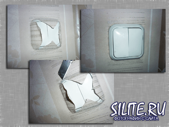 - Aux emplacements des interrupteurs et des prises, avant de coller le papier peint, ces éléments doivent d'abord être démontés. Après collage du matériau, une incision en forme de croix est pratiquée à l'endroit de la prise électrique, puis un trou est découpé sous la pièce existante.