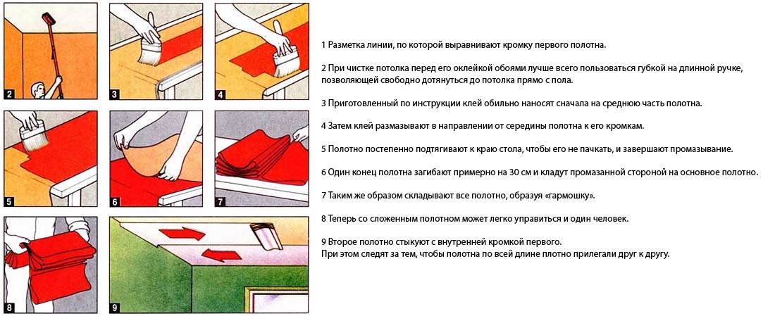 Si activé papier peint en papier la colle doit être appliquée, il est important d'effectuer ce processus correctement afin que le prix de la réparation ne soit pas trop élevé. Le processus de collage d'une bande de papier peint au plafond est illustré dans le diagramme.