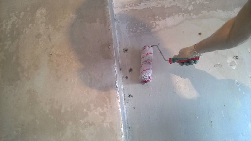 - Tout d'abord, utilisez une brosse sèche et nettoyez toute la poussière des endroits ébréchés. Après cela, il est nécessaire d'humidifier soigneusement la surface du nid-de-poule avec un apprêt - cela liera la poussière restante et améliorera l'adhérence. Laissez le sol tremper et sécher.