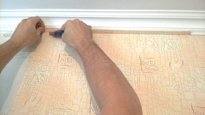 Vous devez maintenant couper l'excédent de papier peint sur les bords de la toile. Si la partie inférieure peut ne pas être uniforme (les bords sont recouverts d'un socle), alors en haut - chaque millimètre compte.