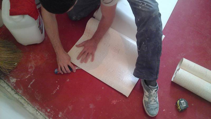 Étalez la pièce résultante sur le sol et étalez une fine couche de colle dessus avec un rouleau. Assurez-vous que les bords de la toile ne restent pas secs. Afin d'éviter que des débris ne collent au rouleau, qui tombera ensuite sur le papier peint, n'oubliez pas de laver le sol à chaque fois avec une éponge humide avant d'appliquer de la colle sur un nouveau lot de papier peint.