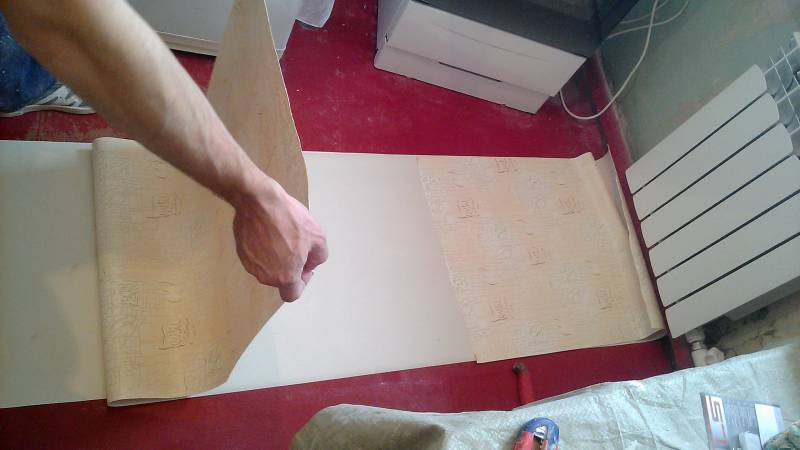 - Voyons comment cela se fait dans la pratique. Lorsque le mur est collé des deux côtés en même temps, au milieu il restera certainement une section dont la largeur ne coïncidera pas avec la largeur du rouleau. Nous coupons un morceau de la longueur souhaitée et le collons, en joignant le long de la couture d'un côté et en nous chevauchant de l'autre.