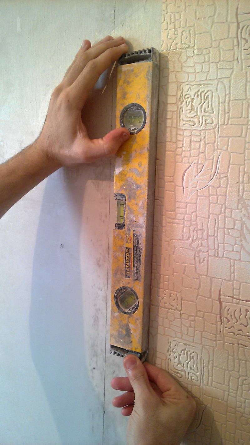 Lors du collage de la première pièce sur le mur, elle doit être alignée verticalement, pour laquelle utiliser le niveau du bâtiment, qui doit être appliqué sur le bord de la toile. Pour simplifier votre tâche, commencez par tracer une ligne verticale sur le mur.