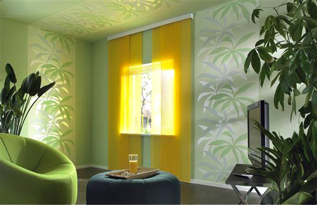 Il y a beaucoup de plantes dans la pièce, donc le revêtement mural avec le motif correspondant semble très harmonieux. Ces options pour la décoration du papier peint de la pièce ne sont pas choisies au hasard, elles sont soigneusement pensées pour que l'éblouissement sur les murs ne se répercute pas dans les yeux. - La base du papier peint textile est également en papier ou en non-tissé. Et la couche supérieure n'est pas faite de fibres, comme le papier peint en sérigraphie, mais de tissu: lin, velours, coton - tout.