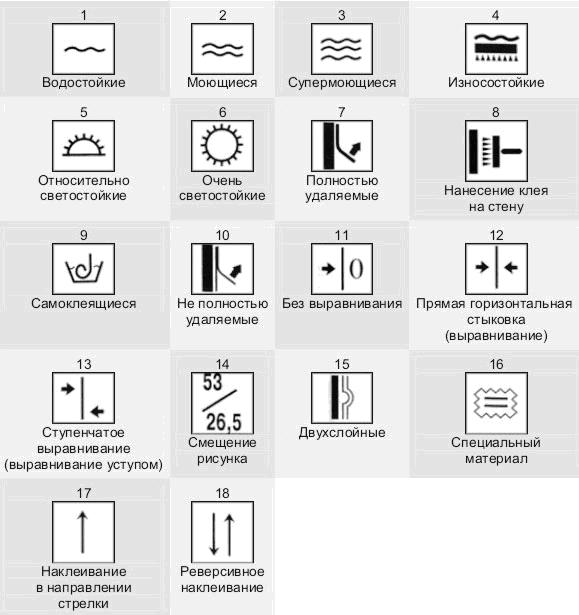 - Chaque type de papier peint possède de nombreuses autres propriétés qui peuvent être trouvées sur l'icône imprimée sur l'étiquette. Les icônes indiquent également comment coller correctement le papier peint, joindre le dessin, les retirer des murs.