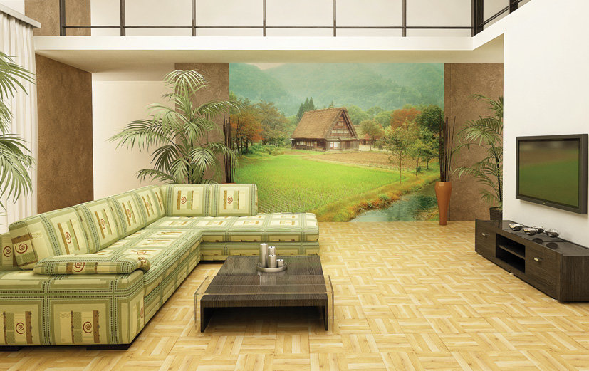 - Sur le papier peint 3D, comme sur le papier peint photo, n'importe quel paysage, plante ou animal peut être représenté. Ce décor est parfait pour les murs des pièces spacieuses d'une maison de campagne.