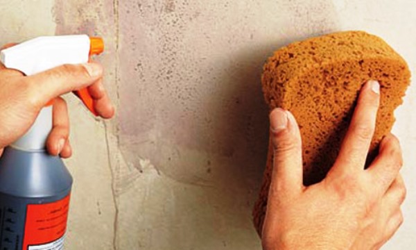 - Si les panneaux secs ne sont pas retirés, ils doivent être trempés. Dans ce cas, il est nécessaire de marcher sur toute la surface avec une éponge préalablement humidifiée avec de l'eau tiède, comme sur la photo. Après quelques minutes, le papier peint sera facilement retiré.