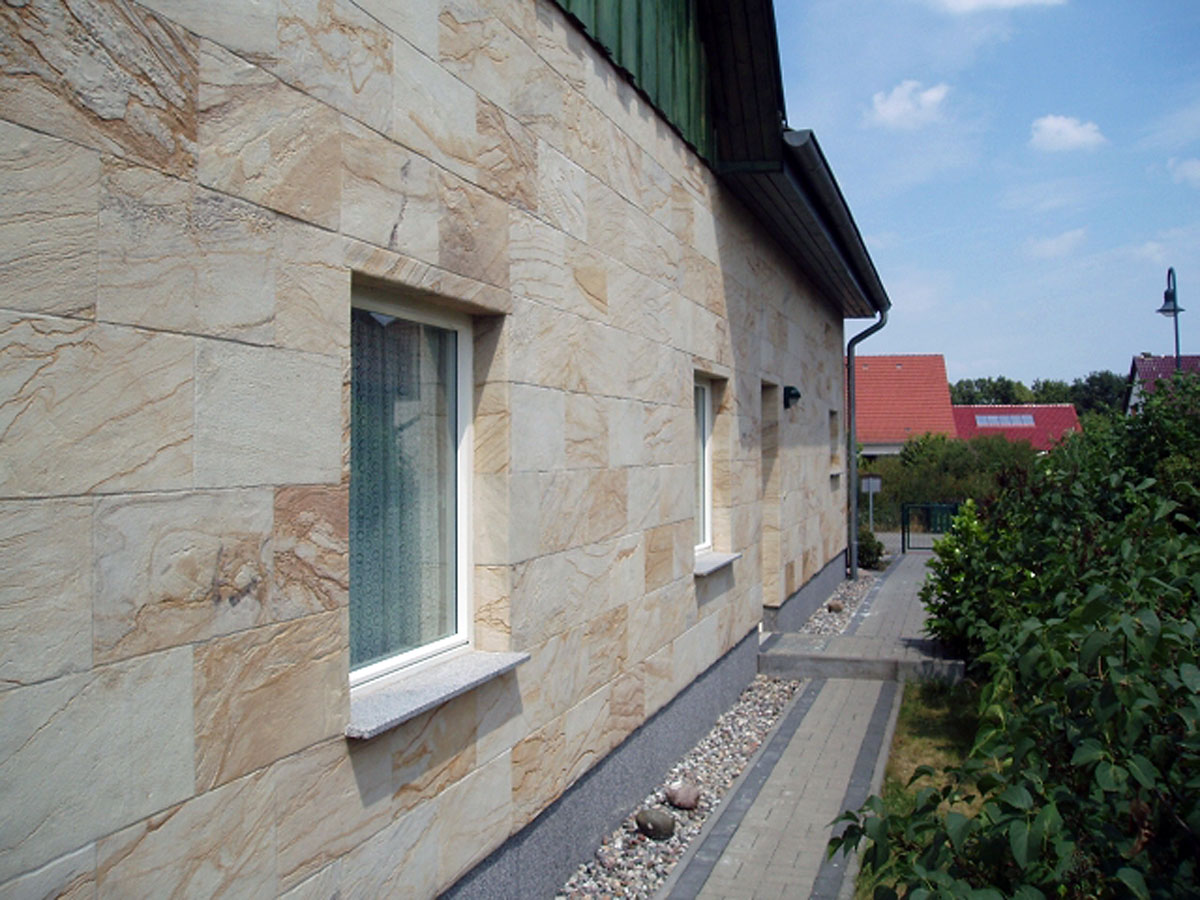 Il s'agit d'un matériau de parement avec imitation de pierre naturelle. Dans sa production, une fine section de grès ou de copeaux de pierre pressée (marbre, granit, quartz) est utilisée, reliée de manière fiable au substrat élastique avec un liant acrylique.