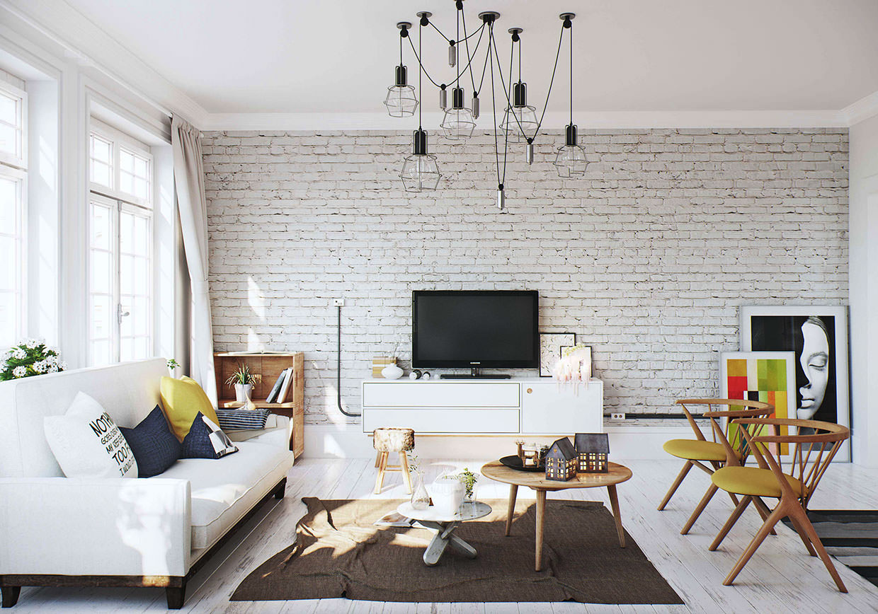 - Les papiers peints en pierre imitant la brique de couleur blanche donnent à la pièce de style scandinave un chic particulier et une touche de noble antiquité. De plus, sur un fond blanc, les éléments décoratifs colorés semblent avantageux, dont il n'y en a pas tellement dans ce style.