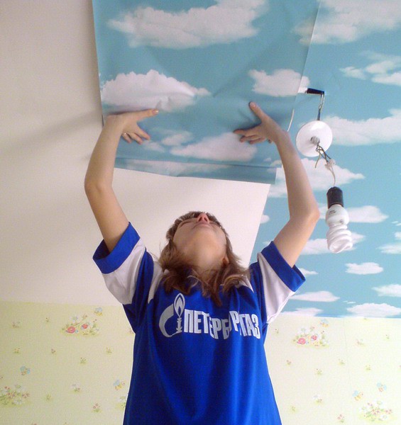 Bien sûr, une personne ne peut pas faire face à un tel travail, donc lorsque vous collez le plafond, vous avez besoin d'au moins deux personnes, et idéalement de trois. L'un d'eux collera le papier peint avec de la colle et servira les deux autres, qui les colleront au plafond. Après avoir appliqué la toile, vous devez éliminer les bulles d'air avec un pinceau, en vous dirigeant du milieu vers les bords. Bien sûr, si vous essayez très fort, vous pouvez tout faire vous-même, mais pas le fait que cela se passera qualitativement.