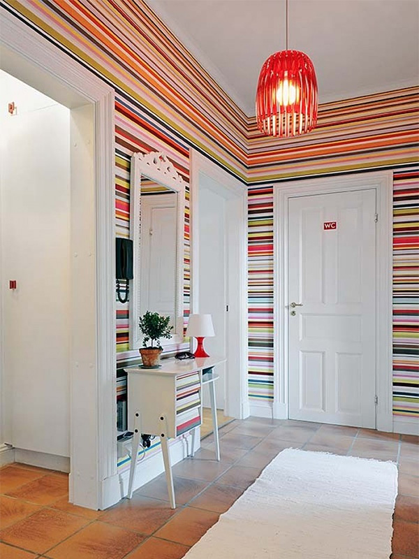 - Les rayures longitudinales ou transversales allongent visuellement la surface ou l'élargissent. Un couloir étroit apparaîtra plus large si les murs d'extrémité sont décorés de rayures transversales. Les rayures verticales feront paraître votre couloir plus haut que la taille réelle;