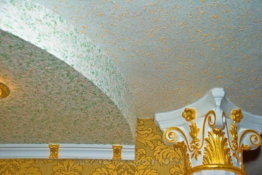 Lors de l'utilisation du matériau, des dessins peuvent être réalisés au plafond (voir Papier peint liquide et dessins: technologie d'application)C'est assez simple à faire, mais cela prendra beaucoup de temps supplémentaire, beaucoup plus qu'avec une décoration de surface conventionnelle.