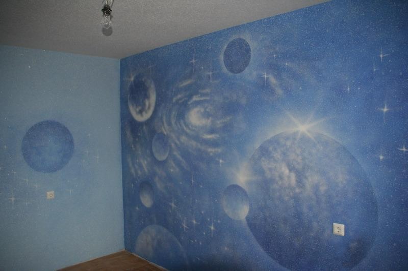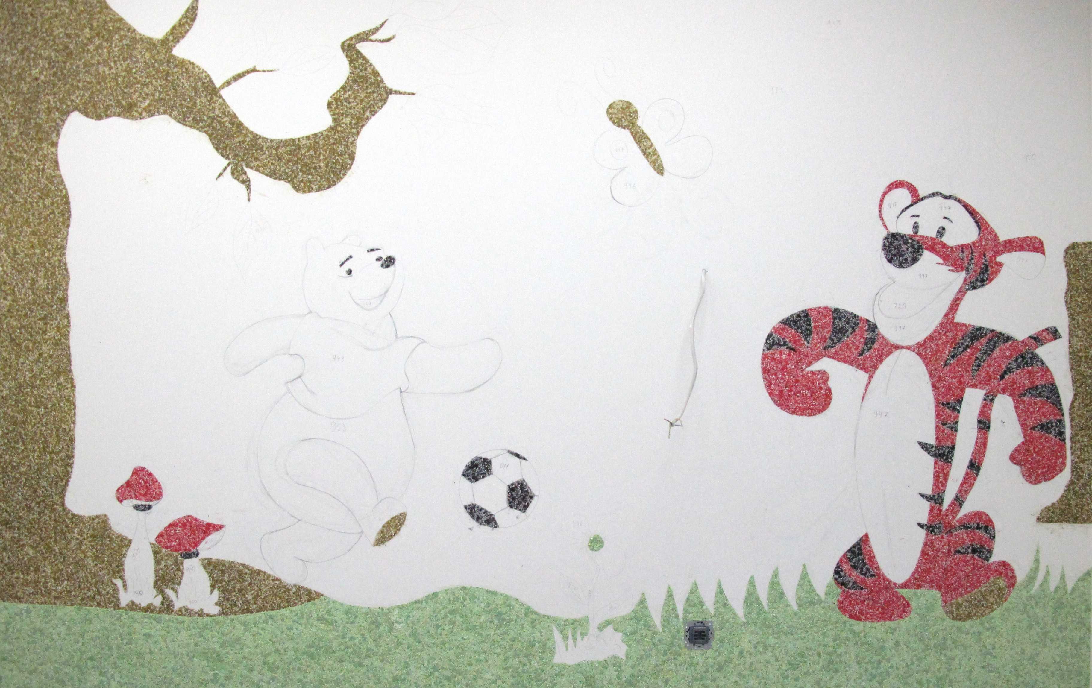 - Avec un crayon ou un marqueur, le contour du futur dessin est appliqué au mur et chaque section est marquée de la couleur à fermer.
